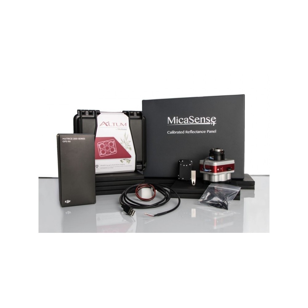 El kit Altum viene con: sensor Altum, cubierta de lente, dispositivo de almacenamiento externo (USB 3.0) - 128 GB, panel de reflectancia calibrado, nuevo sensor de luz DLS 2 con GPS integrado, cables, tornillos de montaje, estuche rígido.